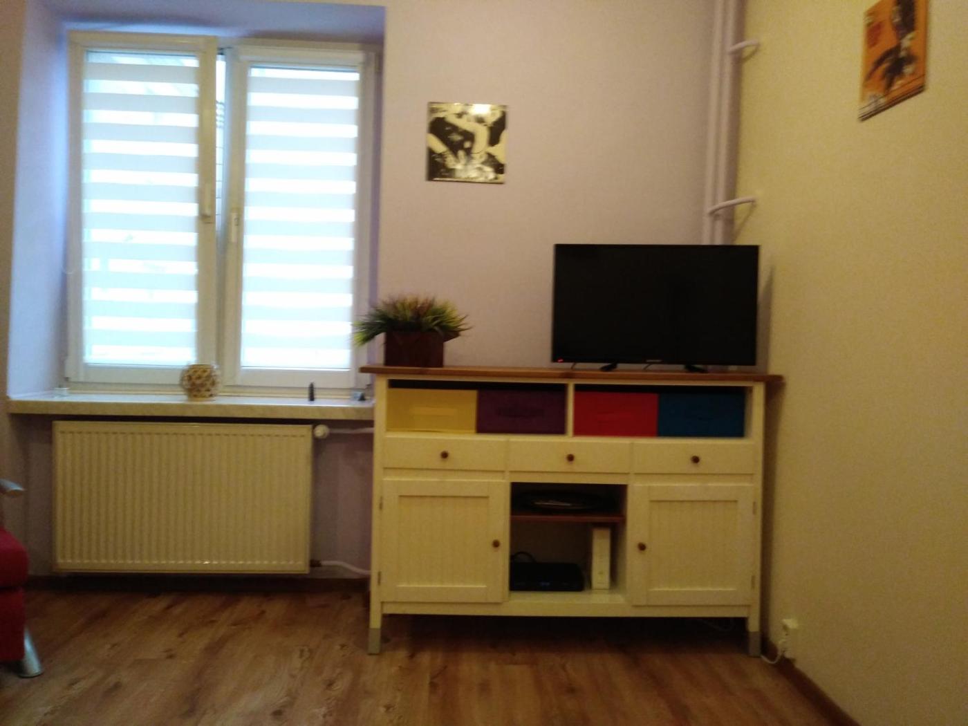 Apartament. This apartment includes 1 bedroom, a kitchen and 1 bathroom with a bath or a shower and a hairdryer. The apartments kitchen, which has kitchenware and a microwave, is available for cooking and storing food. The apartment offers a wardrobe, an electric kettle, a sofa, heating and a flat-screen TV. The unit has 2 beds. Apartament - 2 osobowy. Powierzchnia pokoju ok.: 30 mkw.